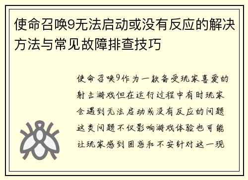 使命召唤9无法启动或没有反应的解决方法与常见故障排查技巧